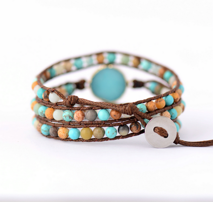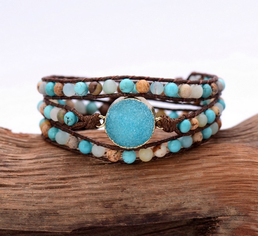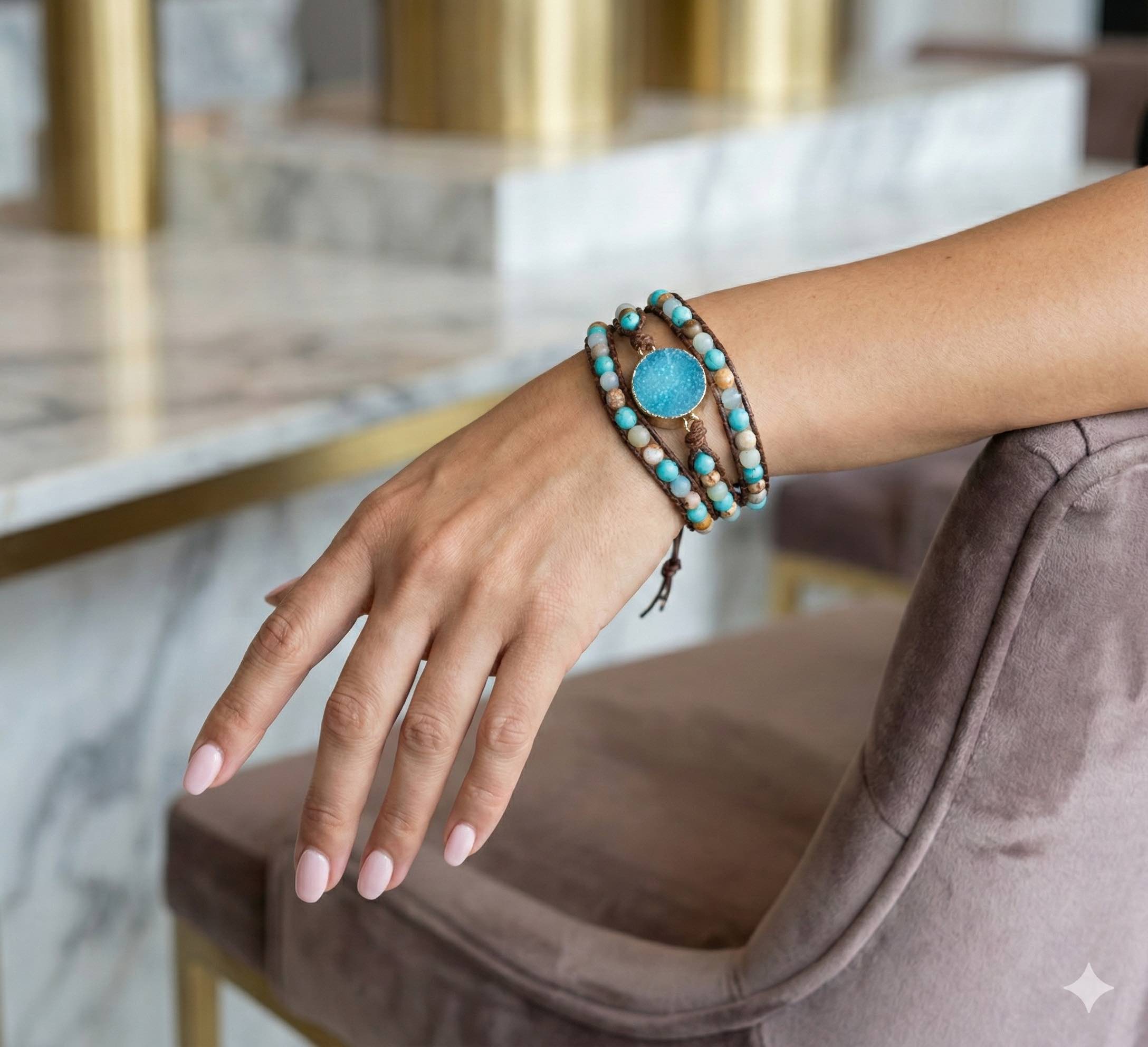 Add a touch of natural beauty to your wrist with the Blue Druzy & Turquoise Beaded Wrap Bracelet. Designed for the free spirit, this bracelet captures the essence of a beachside sunset, blending rugged leather textures with the shimmer of semi-precious stones. It’s the perfect accessory for layering with a watch or wearing solo as a standout piece.