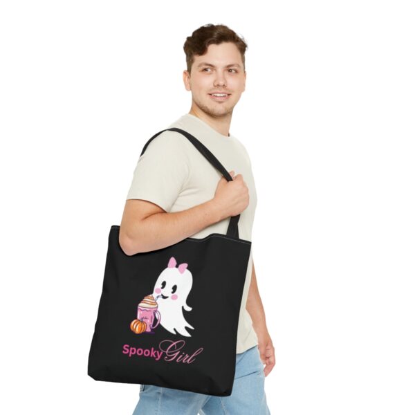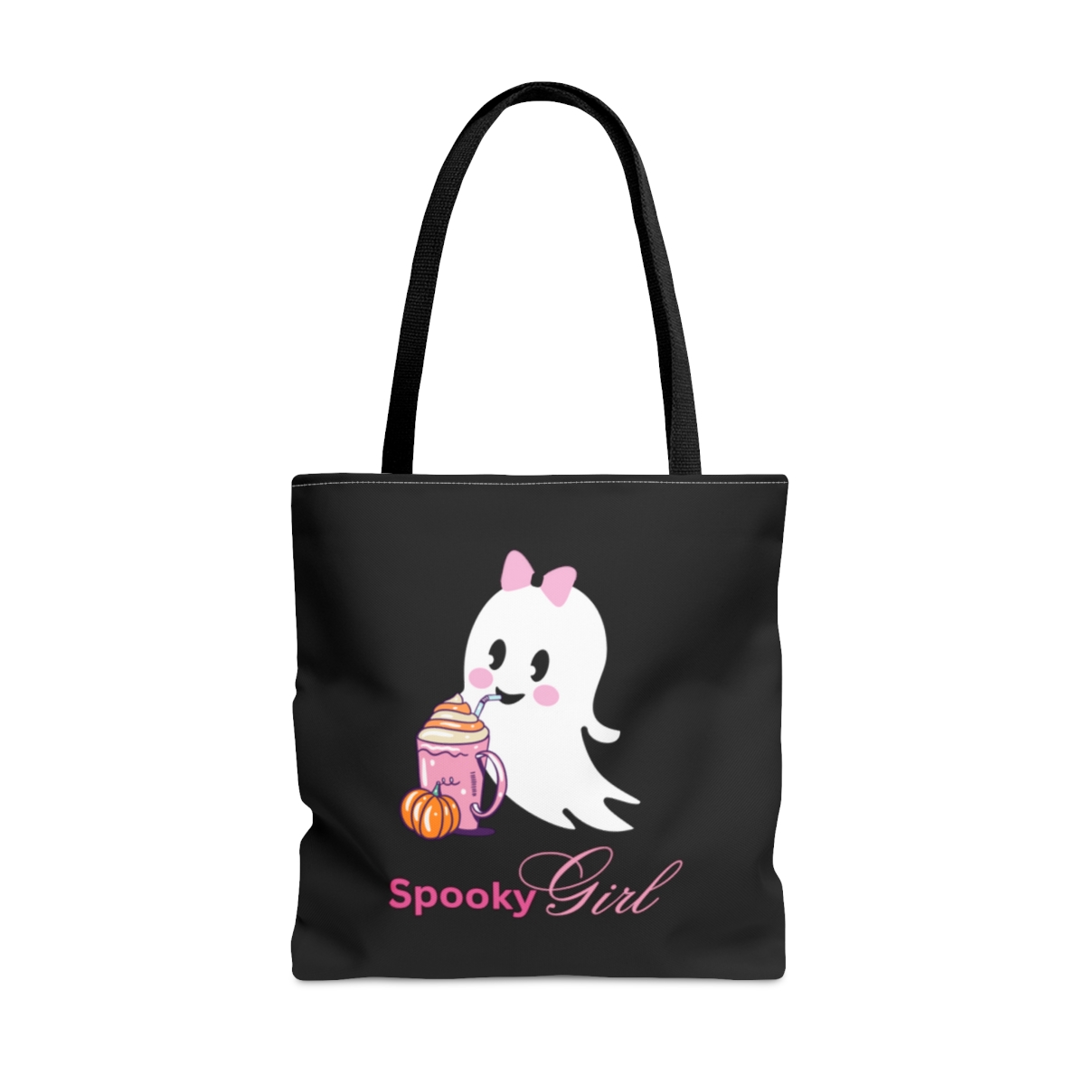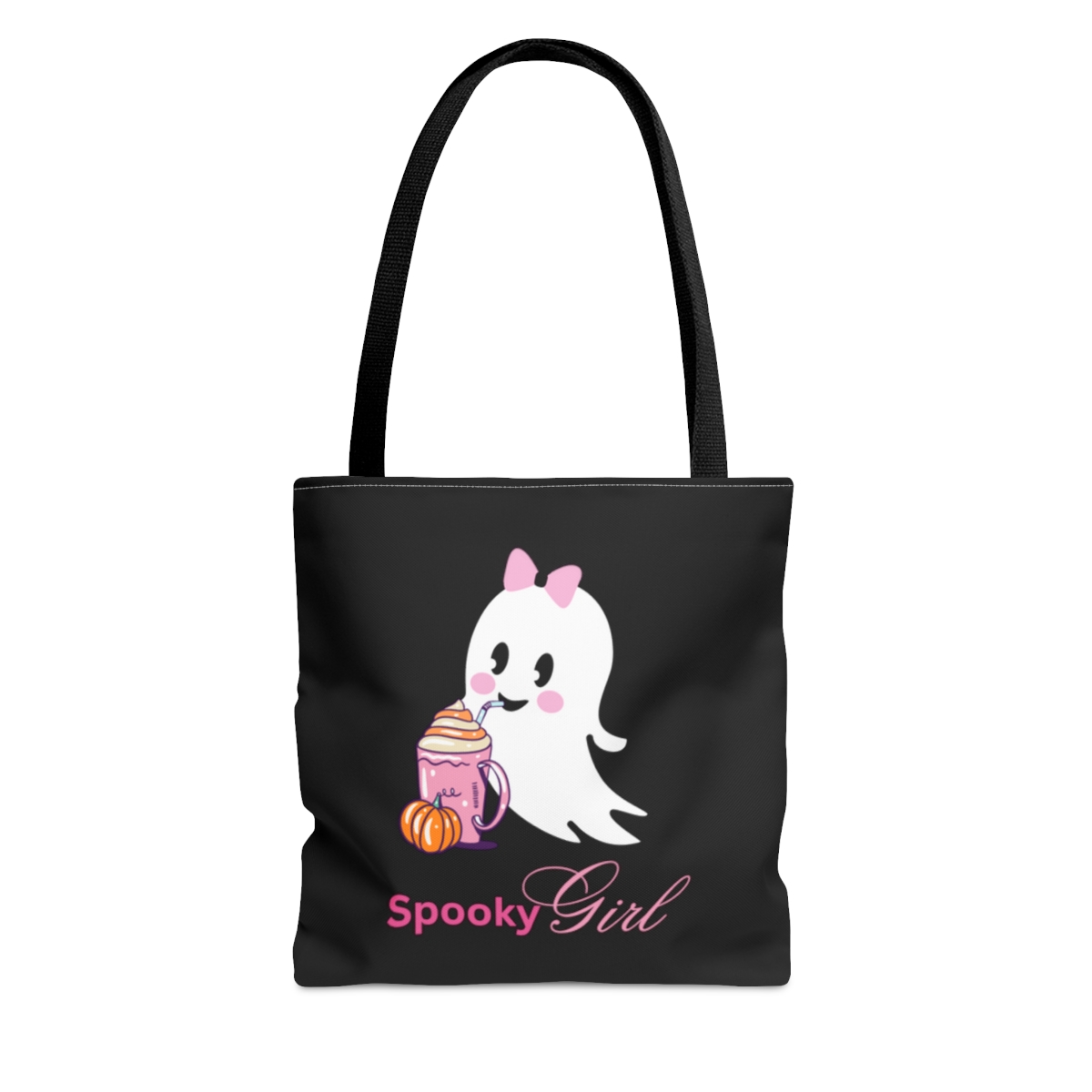 Discover the perfect blend of fashion and functionality in our exclusive collection of spooky tote bags. Our signature design features a cute ghost sipping from a cup, accompanied by the message “Spooky Girl” and a charming little pumpkin—perfect for capturing the essence of the season while adding a touch of whimsy to your look!